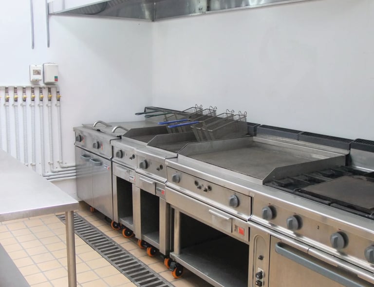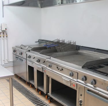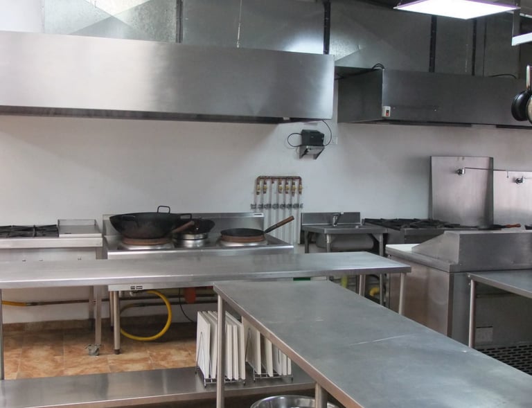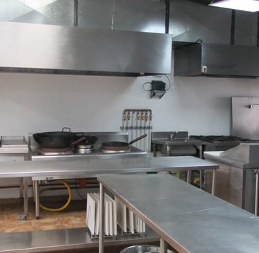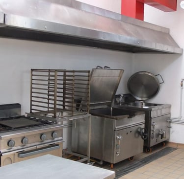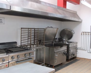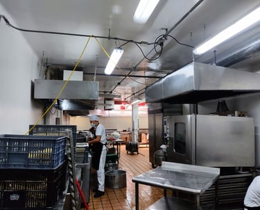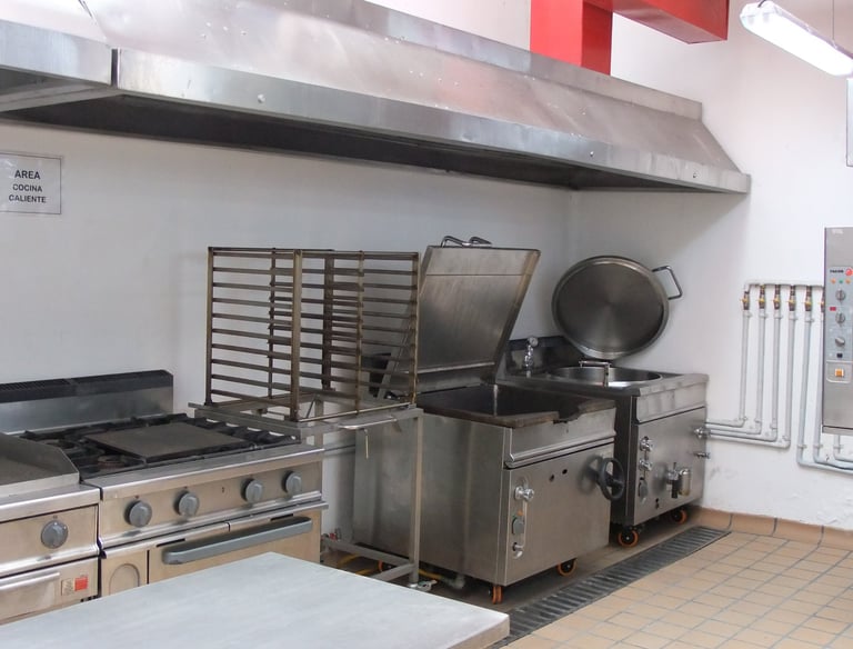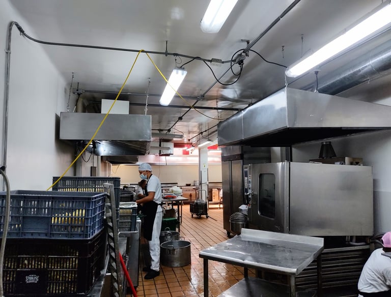 La planta incluye dos cocinas industriales en primer y segundo piso, que pueden operar de forma independiente o integrarse para mayor capacidad de producción mediante ascensor de carga.