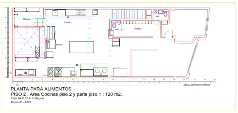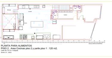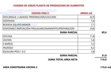 Zona de cocción: (1) Estufa wok de dos quemadores, (1) Estufa de dos quemadores, (1) estufa de 4 quemadores, Poceta central con suministro de agua. (2) Campanas extractoras contra muro con sistema de extracción tipo hongo.