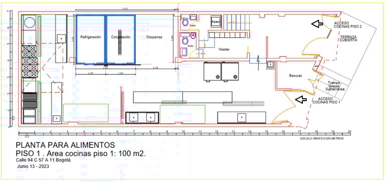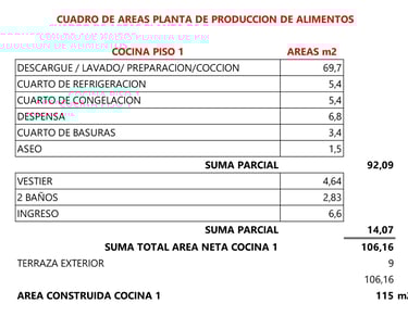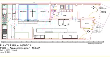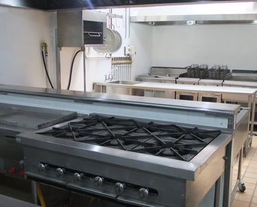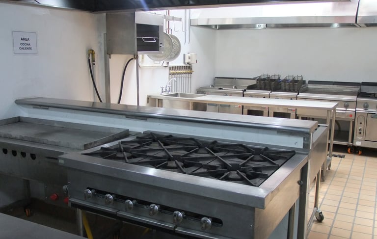 Zona de cocción contra muro: Compuesta por (2) freidoras a gas de 20 litros cada tanque, (1) plancha lisa a gas, (1) planchas ranurada, (1) Estufa de 6 quemadores, (1) Marmita a gas indirecta de 150 litros, (1) Sartén basculante a gas de 80 litros. (1) Campana contra muro con sistema de extracción tipo hongo.